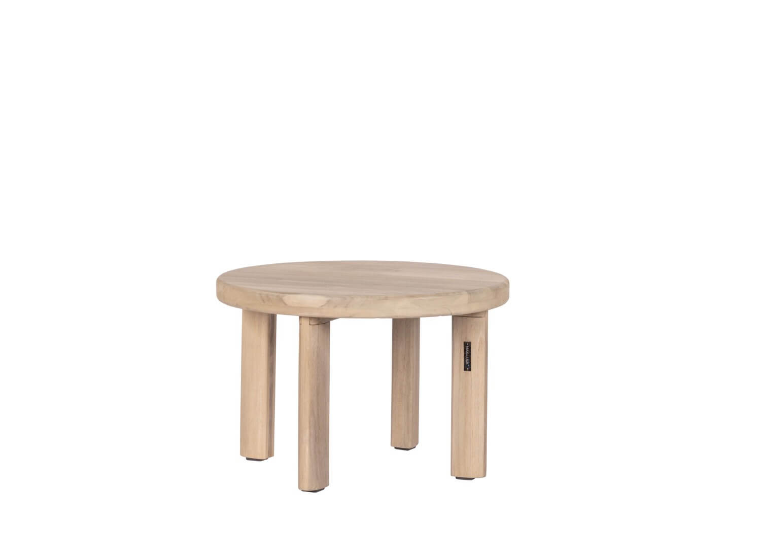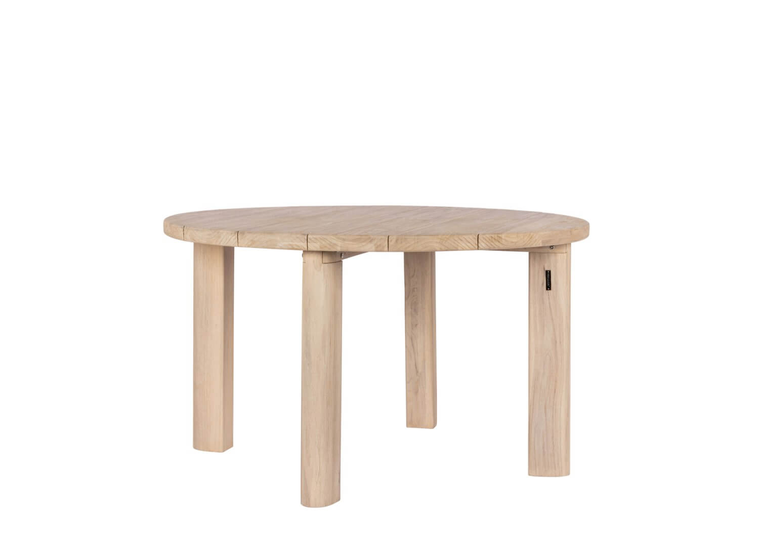 Een eenvoudige vormentaal is wat de Lila tafelserie zo krachtig maakt: een rond tafelblad gemaakt van vergrijsde teakhouten latten ondersteund door een frame van hetzelfde materiaal uitgevoerd met vier robuuste poten aan de rand van het blad. De grote tafel waar je heerlijk aan kunt eten is uitgerust met een blad van honderddertig centimeter doorsnede. Je kunt de Lila-serie desgewenst doorvoeren in je complete tuininrichting door andere tafels uit de collectie toe te voegen. Er is namelijk ook een Lila bijzettafel met een blad van een meter en een van zestig centimeter.