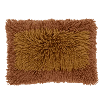 Dit speelse langharige kussen is eigenzinnig in materiaal en bescheiden grafisch van patroon. De combinatie van de twee kleuren bruinrood en goudbruin zorgen voor een subtiele twist.