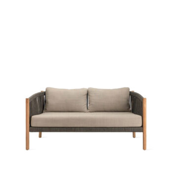De Lento lounge sofa van Bertrand Lejoly wordt gekenmerkt door een mix van natuurlijk teakhout, tactiel polypropyleen touw en comfortabele kussens. De prominent aanwezige massief teakhouten poten en de hoge rugleuning van geweven touw geven de stoel een rijke en innemende persoonlijkheid.